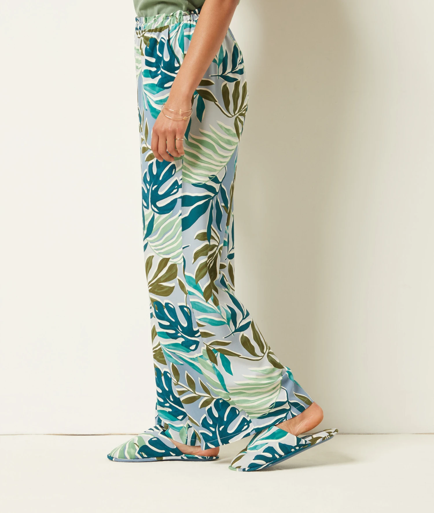 Ces mules ouvertes sont munies d’une semelle souple ultra confortable et dévoilent un motif jungle. Ils s’associent à merveille à un pyjama léger pour l’été.