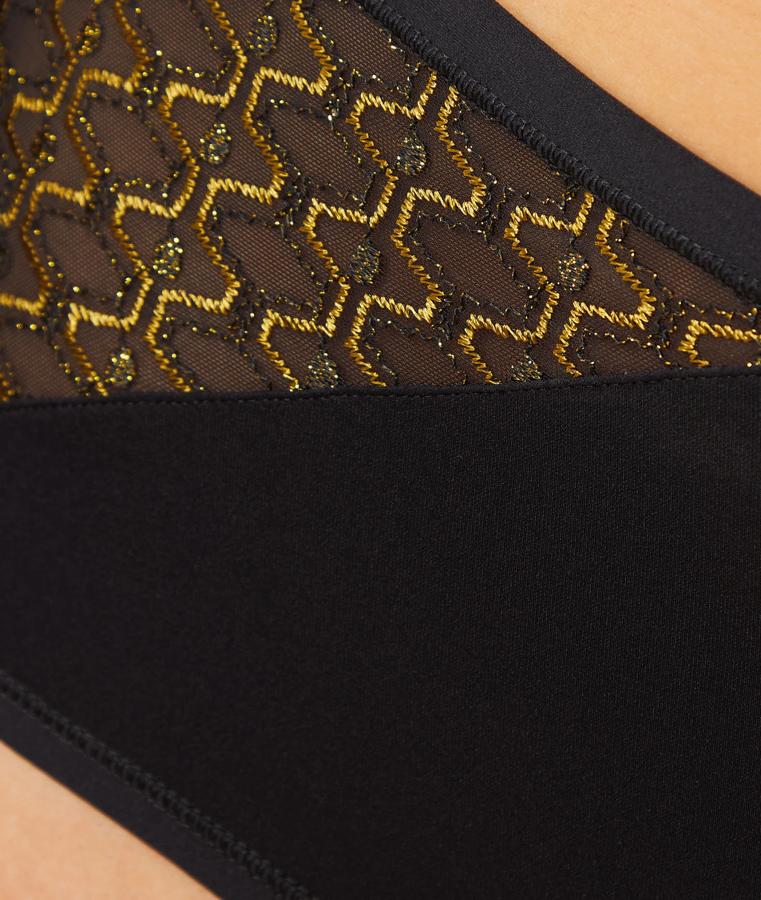• Broderie graphique au fil lurex doré sur tulle extensible et gainant