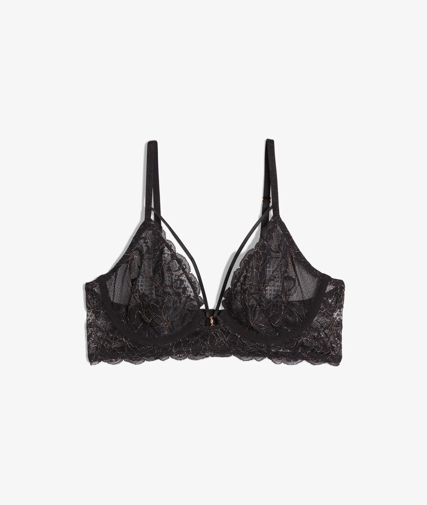 Optez pour un décolleté délicatement sublimé dans ce soutien-gorge sans coques orné de dentelle fine et de borderies dorées. Des liens sensuels suivent le galbe des seins et se ponctuent de jolis bijoux.